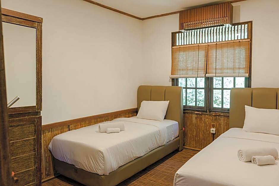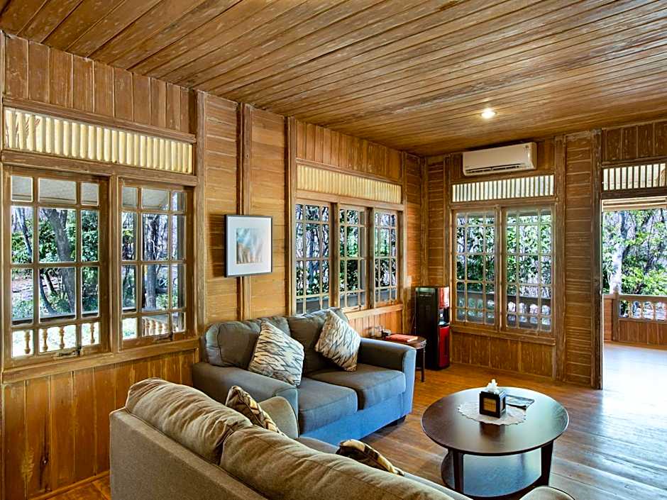 A private, air-conditioned room with semi outdoor bathroom with a hot water shower, a working desk, a wardrobe, and a terrace.